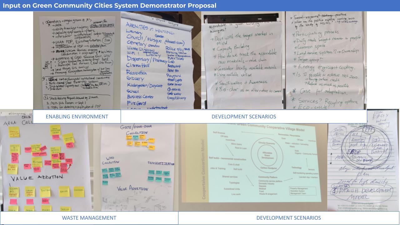The aim of the workshop was to share Green Community Cities’ proposal and seek further guidance and feedback to build partnerships for the implementation of the system demonstrator. Detailed discussions on the enabling environment, architecture and urban design, development scenarios and waste management were led by members of the Green Community Cities and shared with the wider participant group later in the day.